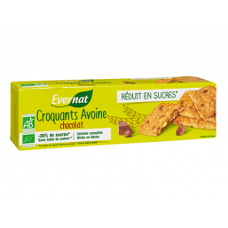 Flocons d'avoine* complet 31%, farine de blé* 29%, huile de colza*, sucre de canne* non raffiné, pépites de chocolat* 9% (sucre de canne*, pâte de cacao*, beurre de cacao*), riz* soufflés (farine de riz*, sel), fibres d'acacia*, extrait de cacao*, poudre de cacao dégraissé*, poudres à lever: carbonates d'ammonium, carbonates de sodium; émulsifiant: lécithines (tournesol); sel de mer, antioxydant : extraits de romarin*