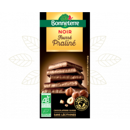 Elaboré par un Maître Chocolatier Suisse dans le plus grand respect des traditions, laissez-vous tenter par un chocolat généreux avec 49 % de fourrage Praliné. En plus d'être bio et gourmand, cette tablette est sans lécithines et fabriquée avec des ingrédients d'origine tracée issus du commerce équitable. Bonneterre vous offre des produits gourmands, engagés et Bio jusqu'au Goût !