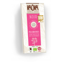 Tablette de chocolat noir bio à 55% de cacao, aux éclats de framboises, en 100g.