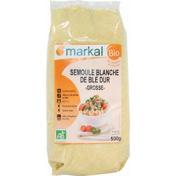 Semoule de blé dur blanche bio, grosse, en sachet de 500g.
