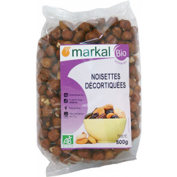 Fruits secs bio noisettes décortiquées, en sachet de 500g.